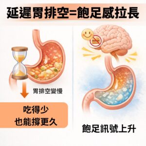 - 白話解釋: 當食物在胃裡停留的時間變長,胃壁會持續傳送牽張訊號給大腦,讓您在進食少量食物後就感受到持久的飽足感,自然達成熱量赤字。
